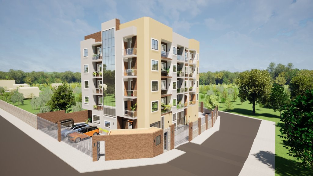 This 80 x 138 foot mixed-use building efficiently uses its sloping plot to offer both premium residential and commercial space. The ground floor houses a 3400 square foot commercial banquet hall with a double-height ceiling and mezzanine, capable of hosting 250 to 480 guests, supported by a professional kitchen. Above this, four residential levels contain a total of 24 modern apartments: four 1-bedroom and two 2-bedroom units per floor, each with a private balcony and keypad entry. The development ensures convenience and security with 16 total parking spaces, a manager’s apartment and office with a private bath, and a dedicated security booth.